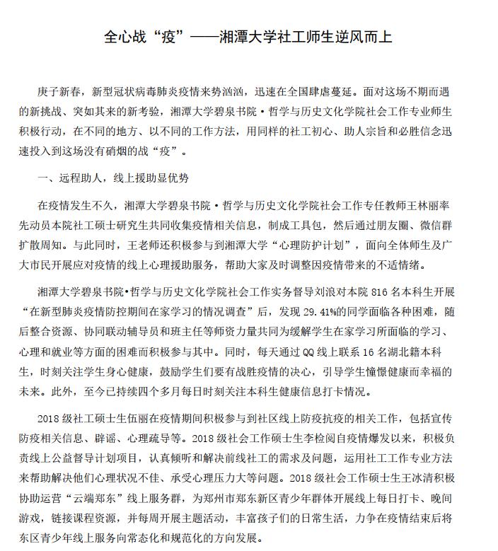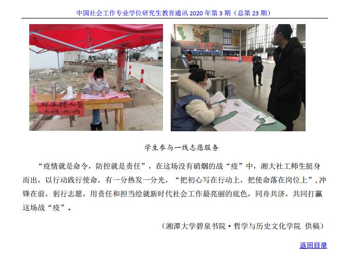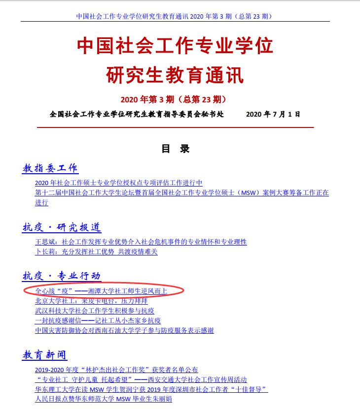 2020年7月1日,由全国社会工作专业学位研究生教育指导委员会秘书处组编的《中国社会工作专业学位研究生教育通讯》(2020 年第3期,总第 23 期)正式发刊,公司社会工作专业硕士教育中心投出的“全心战‘疫’,谈球吧社工师生逆风而上”新闻稿被采用。