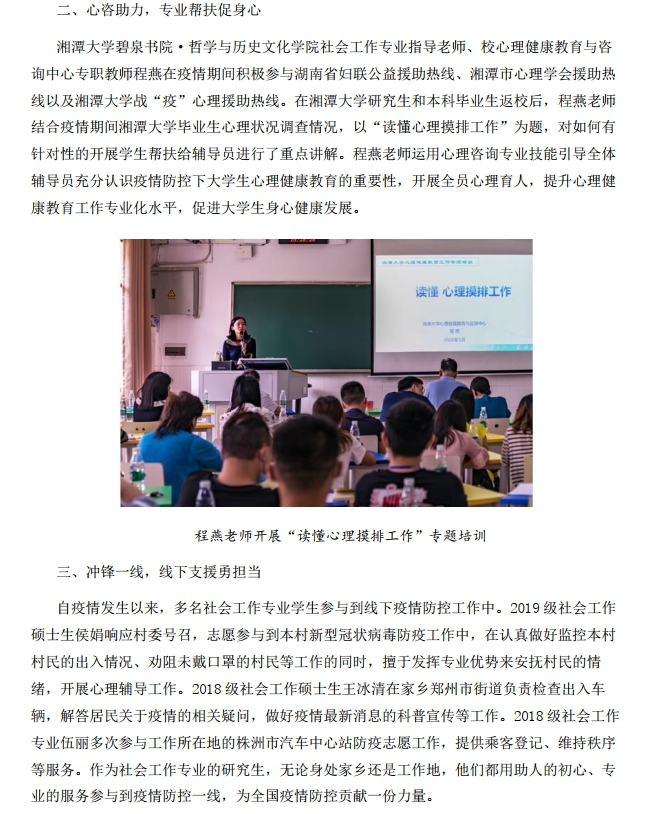自疫情发生以来,公司社会工作专业硕士教育中心高度重视社会工作专业在抗击疫情中至关重要的作用,积极动员社工师生投身于疫情防控的各项服务中,以专业的方法、助人的宗旨和奉献的精神助力全国疫情防控工作。